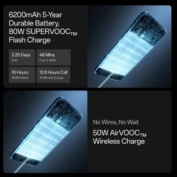 The Oppo Reno 14 Pro is equipped with a massive 6200mAh battery, providing excellent battery life for heavy users. It supports 80W fast wired charging, along with 50W wireless charging.