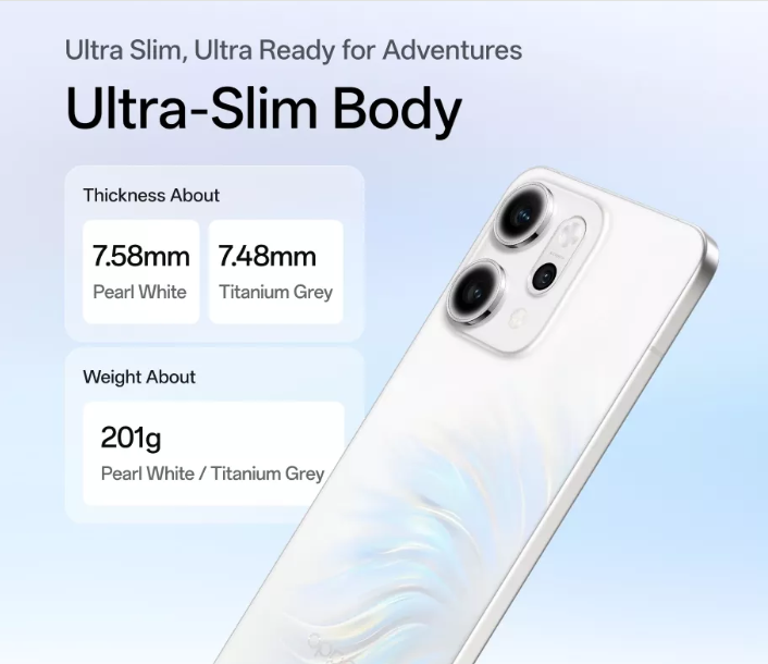The Oppo Reno 14 Pro features a sleek and premium design with dimensions of 163.4 × 77 × 7.5 mm and a weight of 201g, making it slim yet solid in hand. It comes with a glass front and back protected by Gorilla Glass 7i, paired with an aluminum alloy frame.