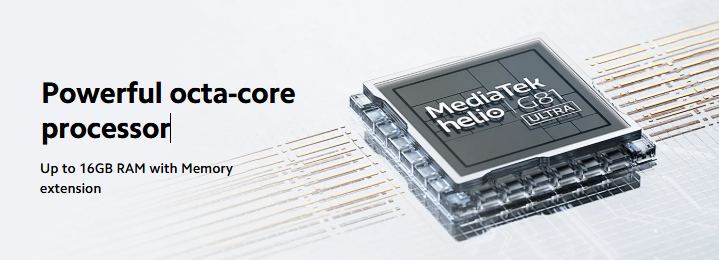 Under the hood is the MediaTek Helio G81 Ultra (12 nm) chipset — a modest but efficient processor suitable for everyday tasks: